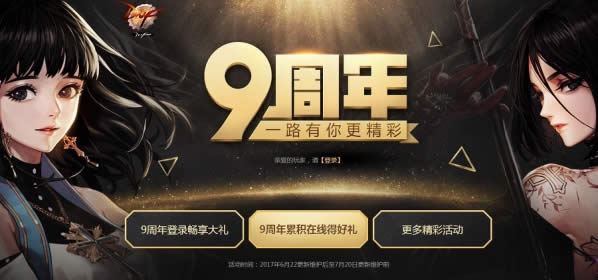 9周年2017年6月24日凌晨6:00至6月25日凌晨6:00登录游戏的用户可以在本页面上领取9周年畅享大礼。