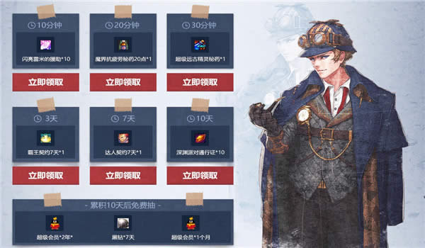 活动奖励:黑钻、番薯、疲劳药、调整箱等,在线30分钟即可领取每日的奖励,连续10天签到可以获得10个深渊通行证。
