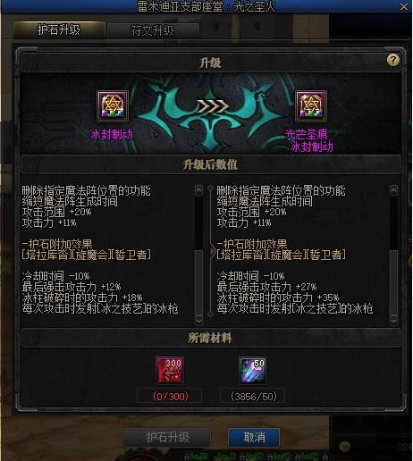 在NPC处,可将魔界大战神器级别的护石升级至光芒圣痕护石,升级消耗300个[黑夜残息]+50个[堇青石]