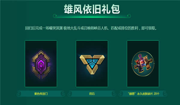 2、获得勇士回归礼包后,获得 1场胜利(大乱斗 5V5召唤师峡谷匹配或排位) 可领取雄风依旧礼包