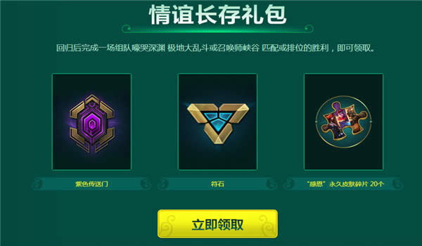 3、获得勇士回归礼包后,完成1场 组队游戏胜利(大乱斗 5V5召唤师峡谷匹配或排位) 可领取情谊长存礼包