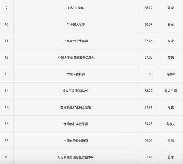 一直以来,关于S7在中国举办的传言一直存在,而通过该榜单我们可以得知,S7在2017年中国体育赛事的价值评价也非常之高。另外在该榜单中,电竞赛事占据了多个席位,如:LPL位列第25位,WCA、ESWC等也均上榜。