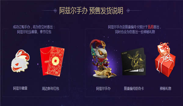 4预售说明:“阿兹尔 手办”为限量预售款手办,手办将在5月发货。在您完成下单后,我们将先为您寄出礼物:阿兹尔纪念徽章、周边春节红包。关于阿兹尔手办具体内容,敬请关注阿兹尔后续专题说明。