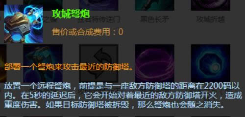 (一)攻击方围城装备攻城弩炮:该装备能在极远的距离下攻击敌人的防御塔,价格100碎片。评价:攻击方的额外助力,常用的攻城拆塔手段。