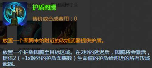 (三)护盾图腾:该图腾可以理解为一个护盾技能,但该护盾可以施加给英雄也可以施加给攻城装备上。价格100碎片。评价:属于攻击方的防御手段,护盾可以让攻城装备的血量多一些,但作为攻击方来说,该技能偏向于被动情境。