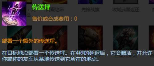 (四)传送坪:在该模式中,传送只能传送到指定位置。而传送坪是额外增加可以传送位置的一件装备。价格200碎片。评价:战略性的装备,能把你传送到“神秘”地方,战术性大于攻击性,没有攻击装备那么直白,但在关键时刻能瓦解敌人守城英雄。