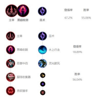 主系符文选择主宰系列黑暗收割,对生命值低于一半的敌人造成伤害后即可触发,将黑暗收割伤害永久提升,恶意中伤可配合E技能造成更多伤害,眼球收集器触发后提升适应力,贪欲猎手具备一定的续航效果。副系符文选择水上行走,加上岩雀的被动效果快速gank,灵光披风使用召唤师技能后提升移速,更容易进行追击或者逃跑。