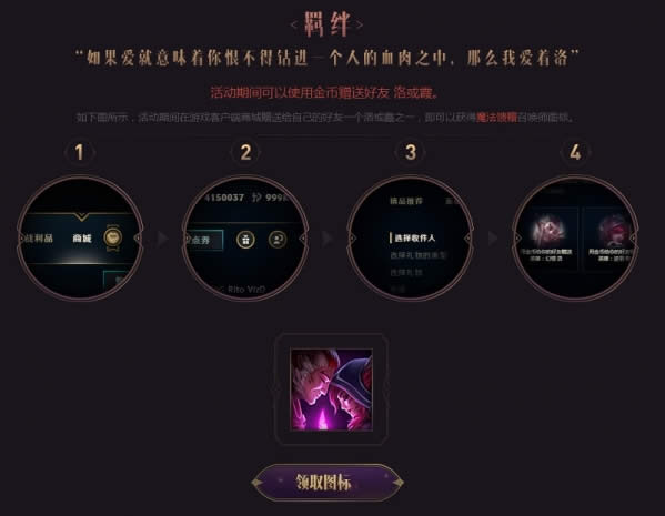如下图所示,活动期间在游戏客户端商城赠送给自己的好友一个洛或霞之一,即可以获得魔法馈赠召唤师图标。