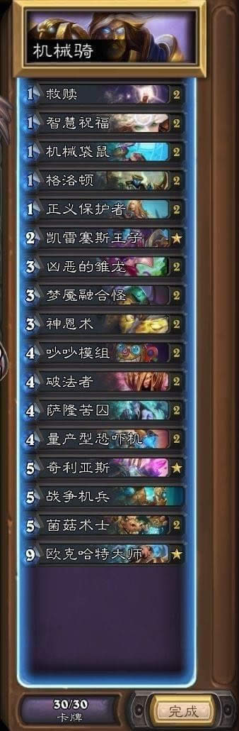经过大家的改进,这套卡组的构筑已经成熟了,欢迎大家偷偷上一波分,卡组名字我都想好了,这套卡组以机械为核心,本身我们又是骑士,其疾如风,就叫“疾风骑吧” 当然也是因为我的id有个风字嘛