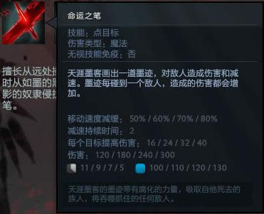 1级一般会在命运之笔和墨涌之间做选择,命运之笔可以猥琐放技能消耗敌人,墨涌可以仗着物理免疫和墨汁输出控制敌人。