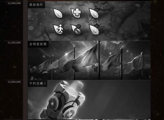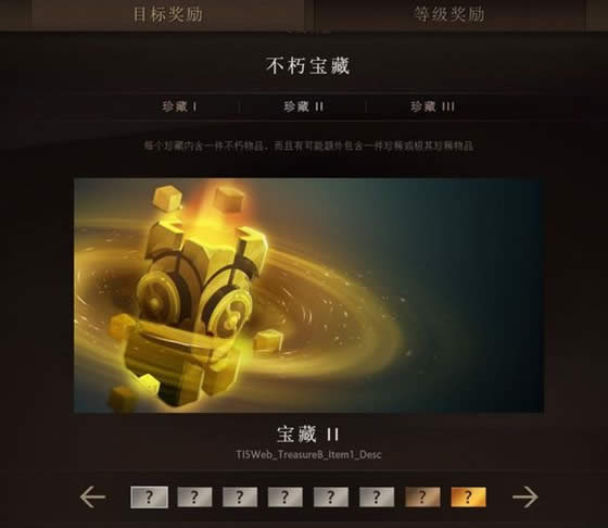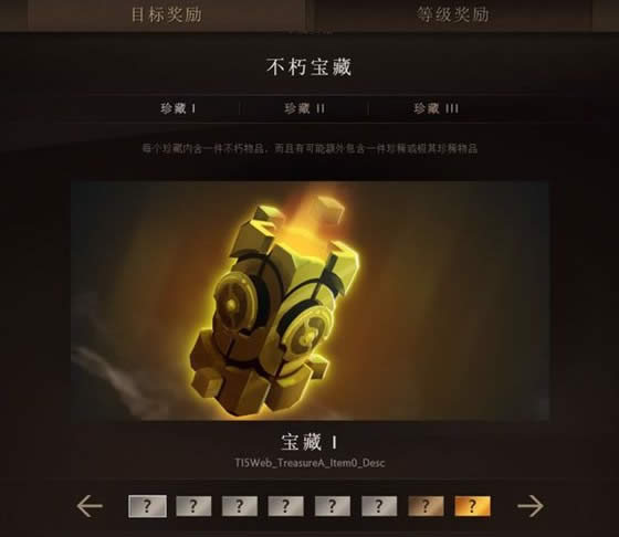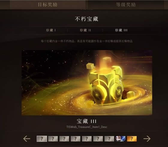 先来看看目标奖励 首先是不朽宝藏 今年有3个珍藏 跟往年不同的是 每个珍藏内含一件不朽物品,而且有可能额外包含一件珍稀或极其珍稀物品(极其珍稀物品可以获得土豪金版本的一个不朽物品 V社在土豪金这条道路上已经一去不复返了) HOHO