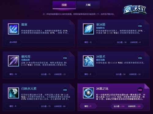 冰霜之环(R1):顾名思义,这个技能的作用范围只是一个外圈的环形区域,不包括范围中心;如果使用智能施法的话对这个“环”的范围要有个大概的印象。此外,尽量不要用该技能作为先手,它的伤害同样会被霜寒的易伤加成。也就是说先用W或者E给敌人上霜寒,再发动冰霜之环打出一个完美的高爆发。