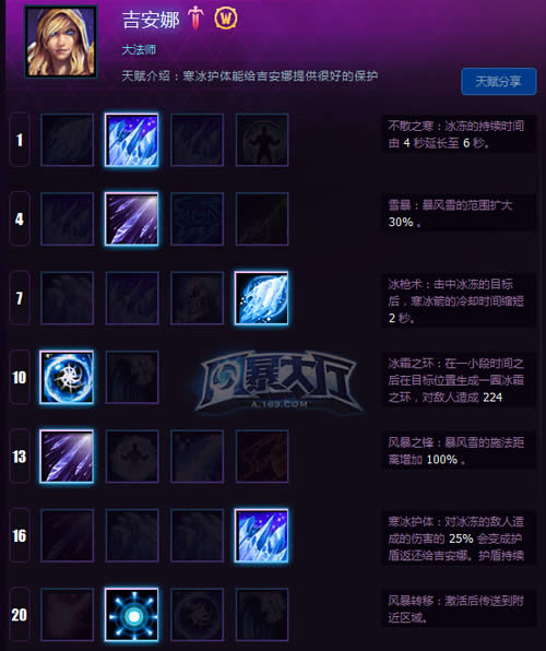 寒冰护体:对冰冻的敌人造成伤害的25%会变成护盾返还给吉安娜;非常强力的天赋,很大程度弥补了吉安娜脆皮的弱点,特别是在兵线上的开团,AOE到的小兵够多的话将提供海量的护盾值。