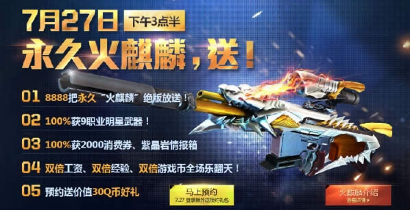 《枪神纪》官方即将在7月27日进行在线奖励活动,届时有8888把永久火麒麟赠送,还有QB以及其他神器奖励,看起来还是非常不错的~!