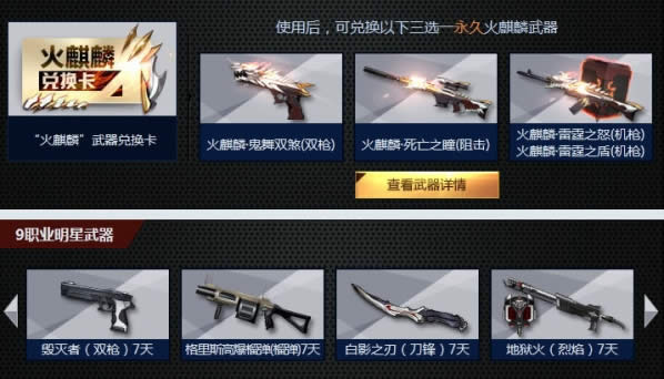 1 “火麒麟”传说系列兑换卡,可兑换1把永久火麒麟武器!