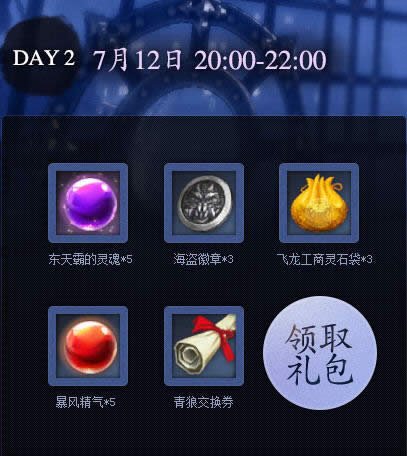 1、45级角色每天20:00——22:00登陆剑灵并完成任意每日任务,即可领取当日礼包;