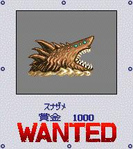 砂鮫(すなさめ) ? 在マド镇和エルニニョ镇之间的沙漠中游荡,地图上就可以看见,接触之后发生战斗。 最初的赏金首,最好拿了战车再交战。 |