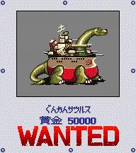 军舰恐龙,最后一个可以开战车来打的赏金首,在メルトタウン附近随机出现。没什么好说的,硬打吧,如果有レーザーゴーゴン的话会好得多。 10发以上打倒则有机会获得世界最强主炮サウルス砲(前提是不考虑正常游戏无法获得的205ミリひぽたん),不过这个主炮的重量也是世界第一的…… |