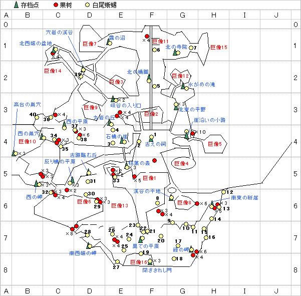 以游戏自带地图为基础,添加了巨像序号,优化了8、12、14号巨像的路线,整合了果树位置、白尾蜥蜴位置、存档点位置。