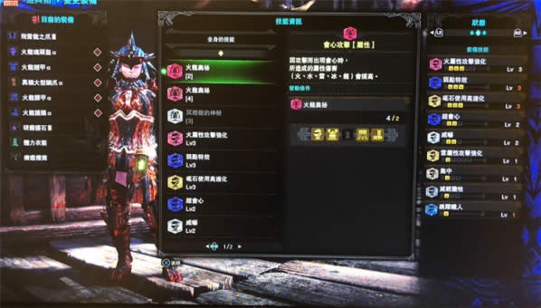 这套就如同我上面写的思路里一样,彻底放弃看破技能的堆叠,转而用更宽裕的配装空间来攒满4件火龙套装,能把火龙奥秘②和④全搞出来。