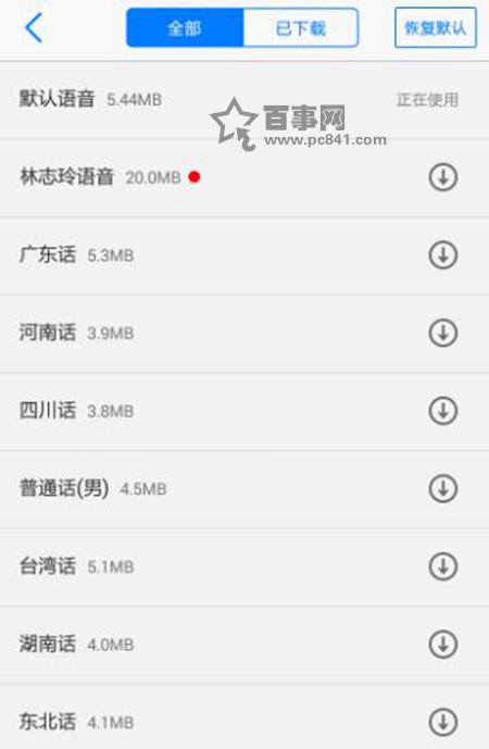 1,如果选择下载林志玲语音包,则需要点击“林志玲语音”栏的下载图标,当然了我们还可以下载其他的明星语音包或者其他地方特色发言语音包。如下图所示:
