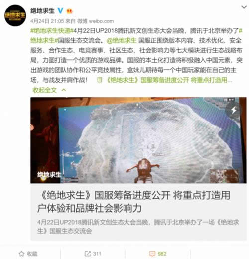 近日《绝地求生》国服官方公布“国服筹备进度”,暗示游戏即将过审。4月22日UP2018腾讯新文创生态大会当晚,腾讯举办了《绝地求生》国服生态交流会,统筹公布了《绝地求生》国服进展。