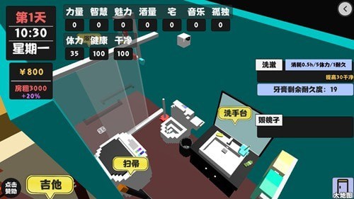 在房屋中我们可以看到各种物品名称,例如床、电脑、手机、垃圾桶、跑步机、吉他、浴室、厨房等,点击这些物品都可以进行相应的动作,例如使用跑步机则可以增加体力上限、提高健康值,但是会降低体力值和干净值。