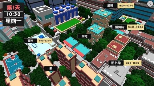 在家里点击右下角的“大地图”我们可以看到城市街区,在街区中可以看到酒吧、网吧、超市、图书馆、借贷所等,它们都有自己的营业时间,我们可以在相应时间内进入其中。