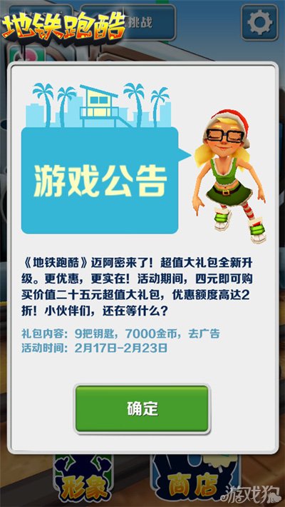 想要了解《地铁跑酷》中最新、*炫、*酷的游戏资讯,那就不千万要错过“游戏公告”,玩家在进入到《地铁跑酷》后就可以随时查看“游戏公告”了解最新一周的游戏活动以及又新增了什么样的超值礼包,让你不在为错过而遗憾。