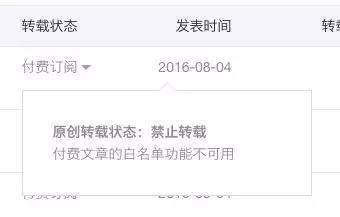点击“付费订阅”则显示原创转载状态:禁止转载,付费文章的白名单功能不可用。”