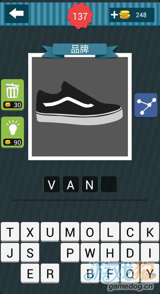 疯狂猜图品牌下,灰色背景上一只黑色的球鞋,猜4个字母的疯狂猜图答案是什么?