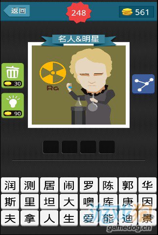 疯狂猜图名人明星4个字分类:疯狂猜图名人明星中有一个背景是黄色背景,有一个电扇的符号并且下面写着Ra,前面是一个外国女子正在做实验,答案是四个字。