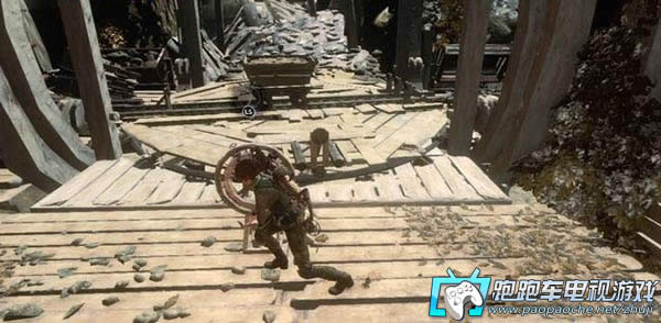 往前有道坡道,滑到末端前起跳,由对面的石壁攀爬上去。