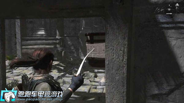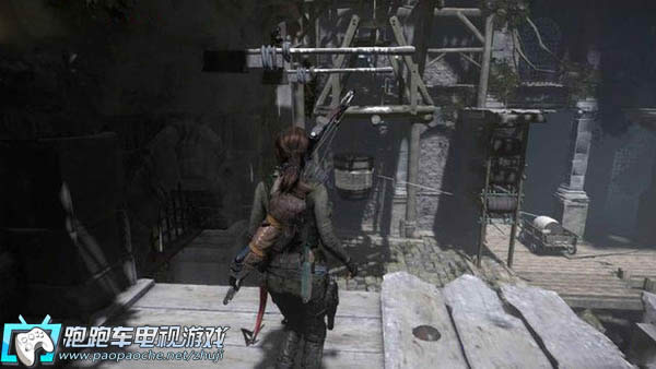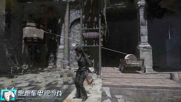 来到主场景庭院,藏宝室在庭院对面的二层。这里谜题的目标是利用两个配重锤来升起两只吊篮(平台),然后利用接通的路攀跳到藏宝室。