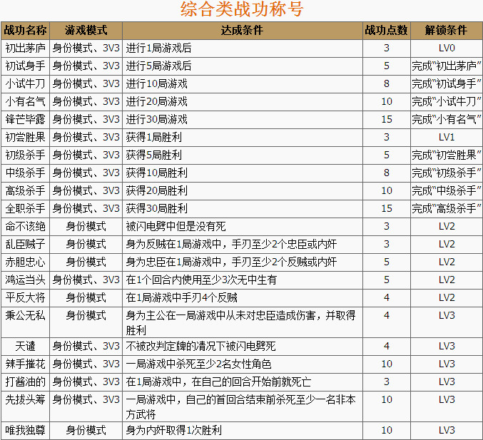 三国杀称号有身份模式下,3V3,1V1模式下的各种称号,跑跑车这里收集了这三个类型的称号,并对获取条件做了一定的解说。开始展示的是综合类称号。
